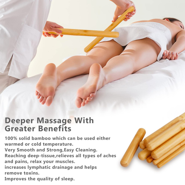 Massage lotion or oil is used with the bamboo. A twelve inch bamboo stick is used for large areas to knead the muscles and also uses a crisscross technique to stretch fascia. The shorter tools are used for small areas and deeper work. The warmth brings relaxation in a shorter time as it quickly penetrates to relax the muscles.