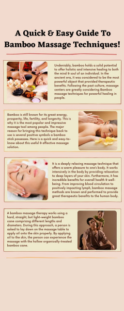 Bamboo fusion massage, sometimes referred to hot bamboo massage, is a ancient Asian massage technique that incorporates a variety of different warm bamboo sticks for deep tissue massage work. The bamboo tools allow the massage therapist to use more strength and stamina for deeper pressure. The smooth sticks allow for more penetrating maneuvers and make deep-tissue work easier.